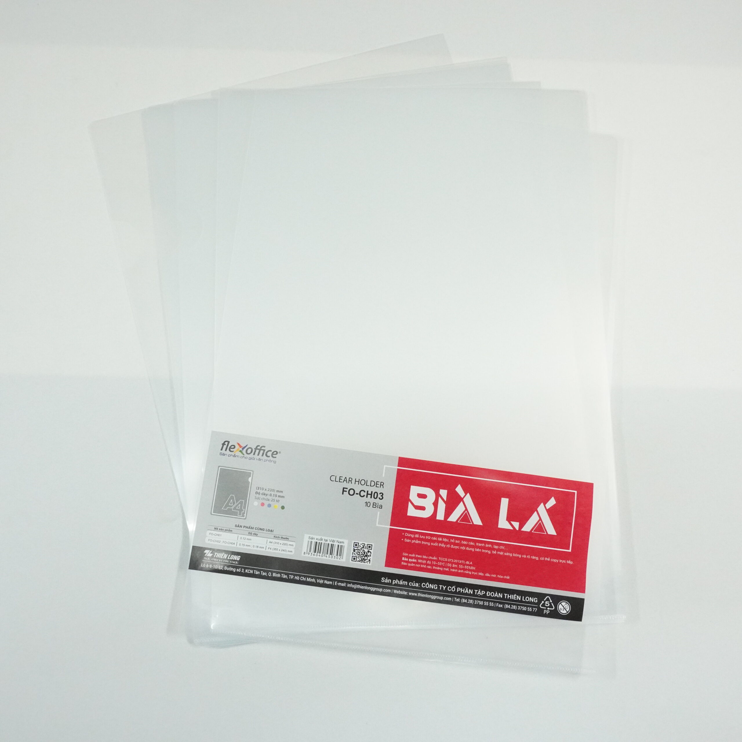 Bìa lá A4 Thiên Long là sản phẩm được sản xuất trên dây chuyền công nghệ hiện đại của Nhà máy Thiên Long – Việt Nam với nguyên liệu từ loại nhựa trong suốt, độ bền cao, khả năng chịu nhiệt tốt.